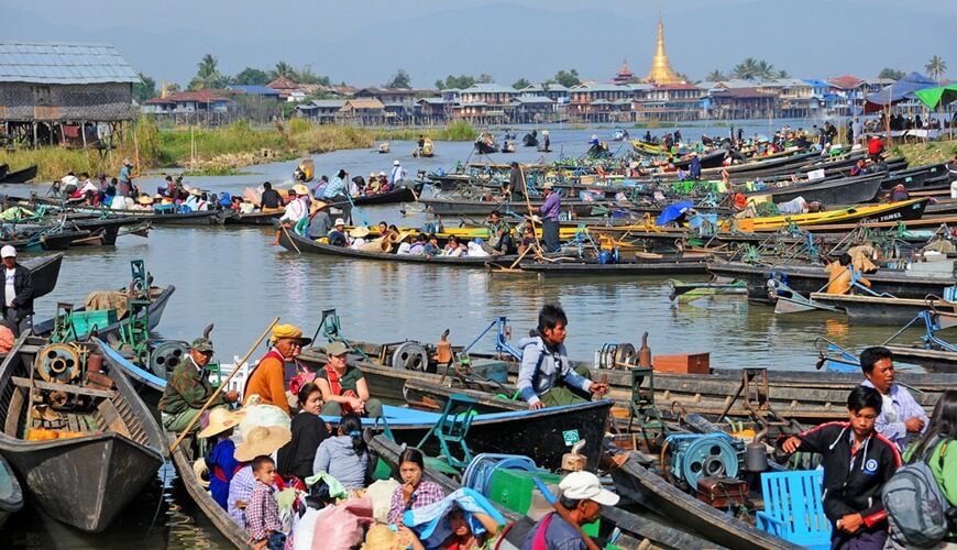 This morning, we pay a visit to the bustling 5-day market on the lake (it is open daily except the dark moon and full moon days of the lunar calendar). The name of the market derives from its characteristic of rotating the location among villages following a scheduled 5 days. En route, we will pass through some villages of Intha people who live in the house – on – stilt, cultivate in the floating garden and master in the incredible one – leg rowing technique.