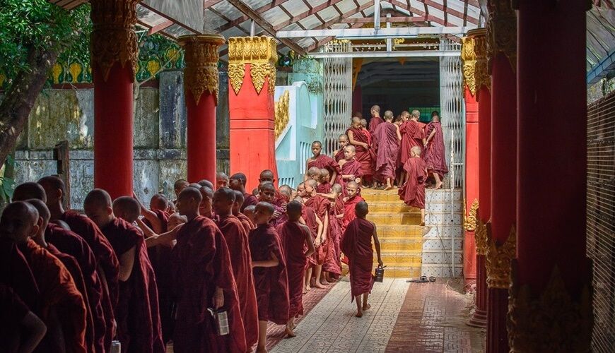 8h30: Meet up our tour guide at meeting point - The Immanuel Baptist Church (next to the Mahabandoola Garden near Yangon city hall) then your trip starts to walk around colonial era buildings of Yangon, where you will have chance to explore the local life of Burmese, take amazing photos of a nearby Sule temple from its outside with hundreds of images depicting mythological scenes. Passing a couple of alleyways crammed with food stalls and markets. You’ll pass the High Court Building, the grand Inland Water Transport offices and even grander Myanmar Port Authority building until you’ll reach Strand Road. Finish at the 19th street of China Town before heading to Kalaywatawya Monastery to see monastic ways of lives and to see Buddhist monks lining up and eating together for lunch.