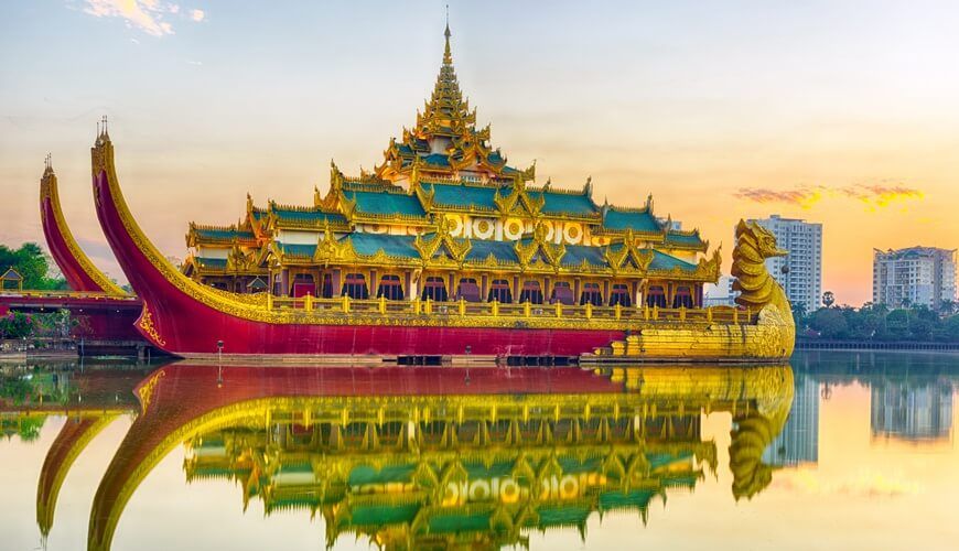 In the afternoon, you continue uptown in order to make a quick stop by the Royal Lake located in Kandawgyi Park which is very popular with local residents, especially in the early morning and around sunset. Catch a view of Karaweik Hall, a reproduction of a royal barge and enjoy a spectacular view of the Golden Shwedagon Pagoda.